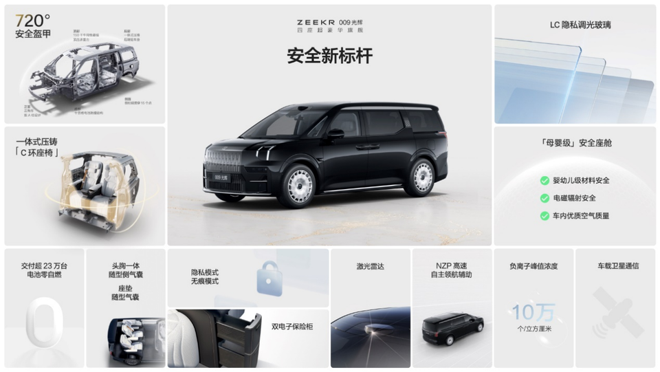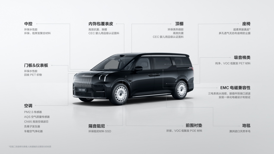 极氪009光辉的材料安全,电磁辐射安全和车内空气质量全部满足“母婴级”使用标准