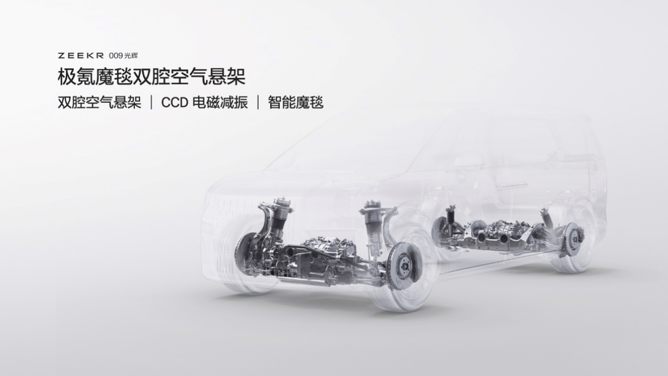 极氪009光辉搭载「极氪式操控」的最新科技——极氪魔毯双腔空气悬架,在CCD电磁减振和双腔空悬组成的主动式悬架基础上,加入「智能魔毯」功能,将车辆底盘域、智驾域打通,利用车载主动感知系统,以及感知和决策算法,智能识别障碍物,实现悬挂软硬的毫秒级调节,成为全球底盘响应速度最快的四座MPV,极致舒适媲美百万级超豪华车。
