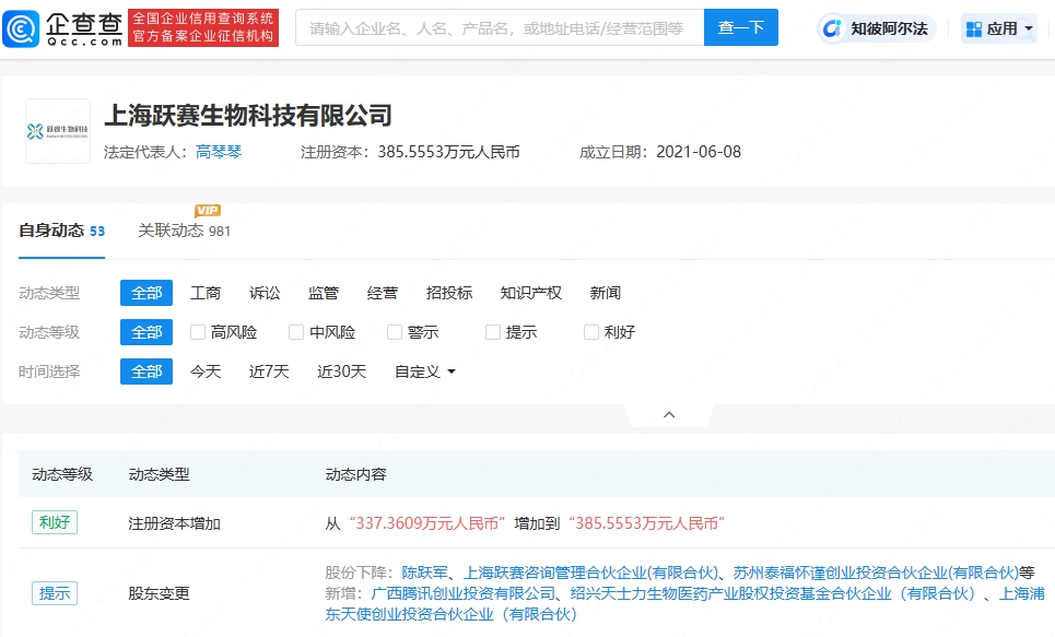 据企查查APP显示,近日,上海跃赛生物科技有限公司发生工商变更,注册资本增加到385.56万元人民币,股东新增广西腾讯创业投资有限公司、绍兴天士力生物医药产业股权投资基金合伙企业(有限合伙)、上海浦东天使创业投资合伙企业(有限合伙)等。
