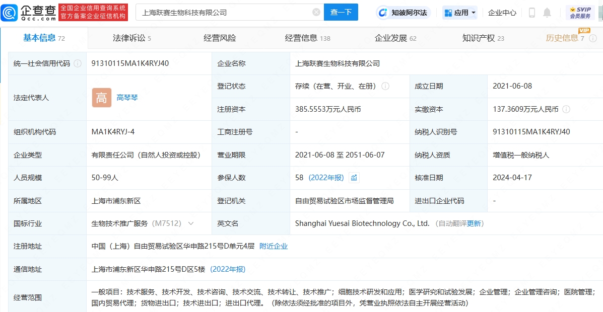 企查查显示,上海跃赛生物科技有限公司成立于2021年6月,法定代表人为高琴琴,是一家专注于开发新一代基于人多能干细胞的细胞治疗药物的创新型制药公司。