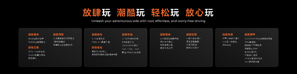 作为一款超级皮卡,雷达地平线不仅拥有超级机械性能,在新三电、物联化、智能化技术方面,同样也达到超级境界。雷达地平线21kW全场景放电功能全球第一,几乎相当于两台Cybertruck的放电能力。