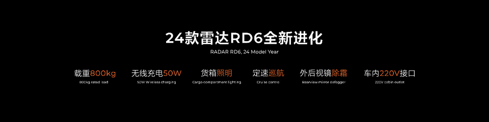 此外,24款雷达RD6也为用户带来了巨大惊喜,其载重能力由原来的450公斤增加到了800公斤,更加契合创客人群需要。驾乘舒适和便利性同时升级,车内新增了50w无线充电功能和220V接口,实现全车用电自由,并配置了定速巡航。外后视镜也增加了除霜功能,环境适应性大大提高。同时,用户呼声很高的货箱照明同样出现在了24款雷达RD6上。这些升级让24款雷达RD6成为创客的最佳搭档,创业之路更加“多快好省”