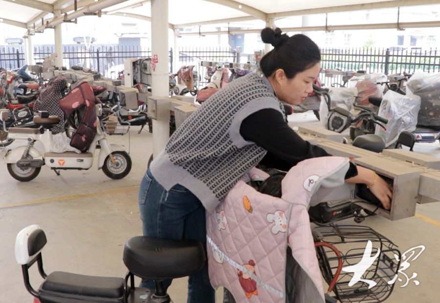 4月20日上午,山头村和山水岸社区一处封闭式车棚前,正巧有村民来存放电动车。只见人脸识别后,车棚的门自动打开,村民推着电动车找到一处空位,插好车辆充电器,熟练地按下了电源控制箱上对应的插座数字按钮。