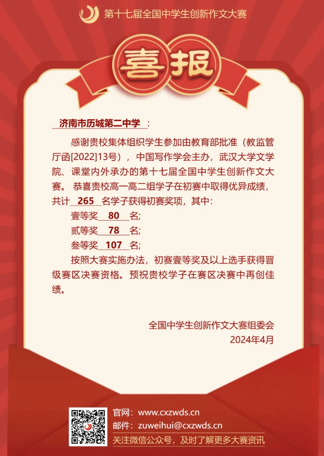 近日,第十七届全国中学生创新作文大赛山东赛区初赛结果揭晓,历城二中高一、高二年级共计265名学生获奖。
