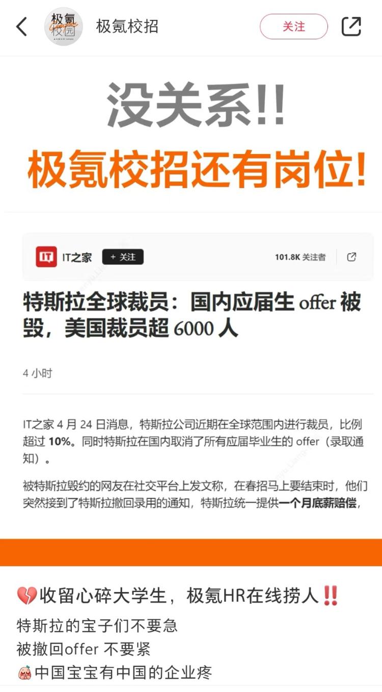 特斯拉被曝毁约应届生:录取通知被撤回 HR告知没人例外