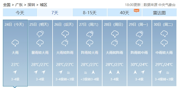 大城市中,像是在广州,一直到本月底降雨都会比较强;深圳未来7天也是雨水不断,其中明天白天或有暴雨现身。
