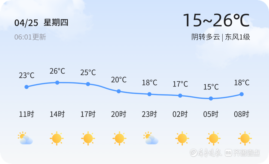 今日日期:2024年4月25日,农历三月十七。枣庄今日天气阴转多云,东风1级,气温范围15-26℃,空气质量良好,PM2.5值为69,对应空气质量状况等级为良。建议市民根据天气变化适时增减衣物,出行携带雨具,以防不时之需。