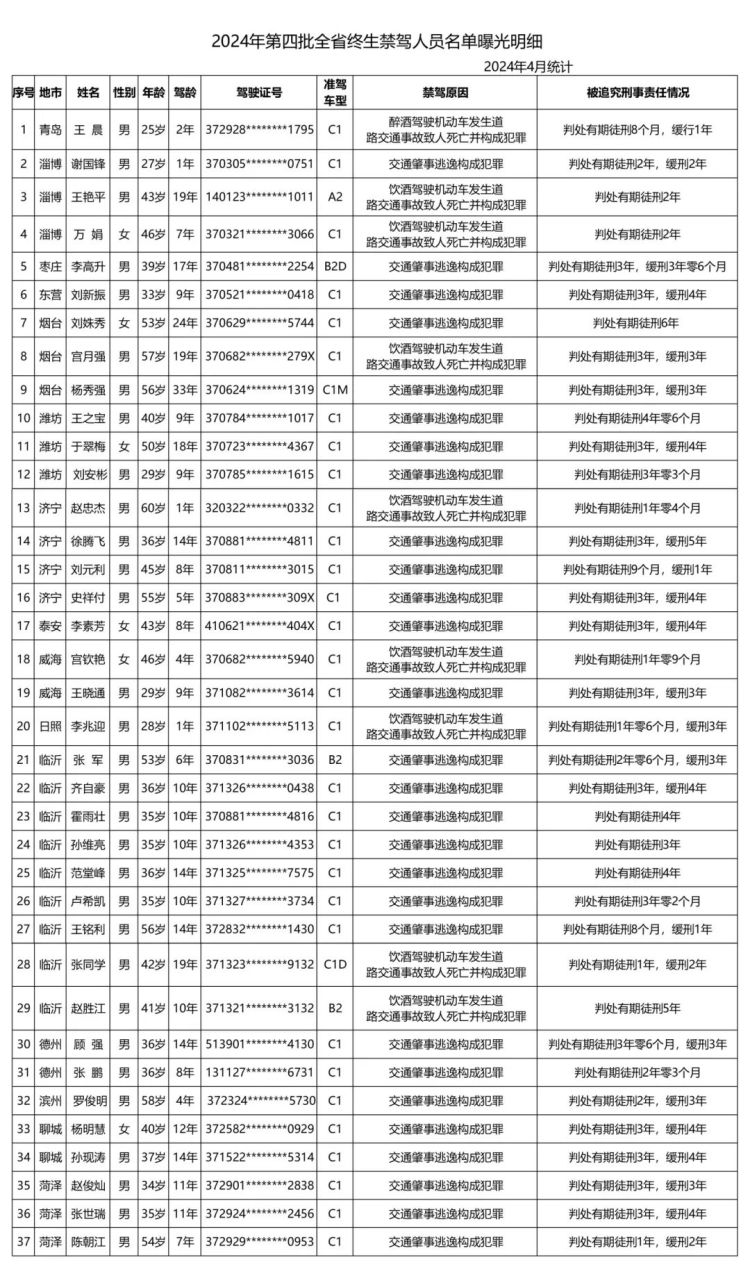 近日,省公安厅交通管理局向社会公开发布今年第四批终生禁驾名单,37人榜上有名。其中,涉及淄博有3人,最长驾龄19年,最短驾龄仅1年。2人因饮酒驾驶机动车发生道路交通事故致人死亡并构成犯罪,1人因交通肇事逃逸构成犯罪。