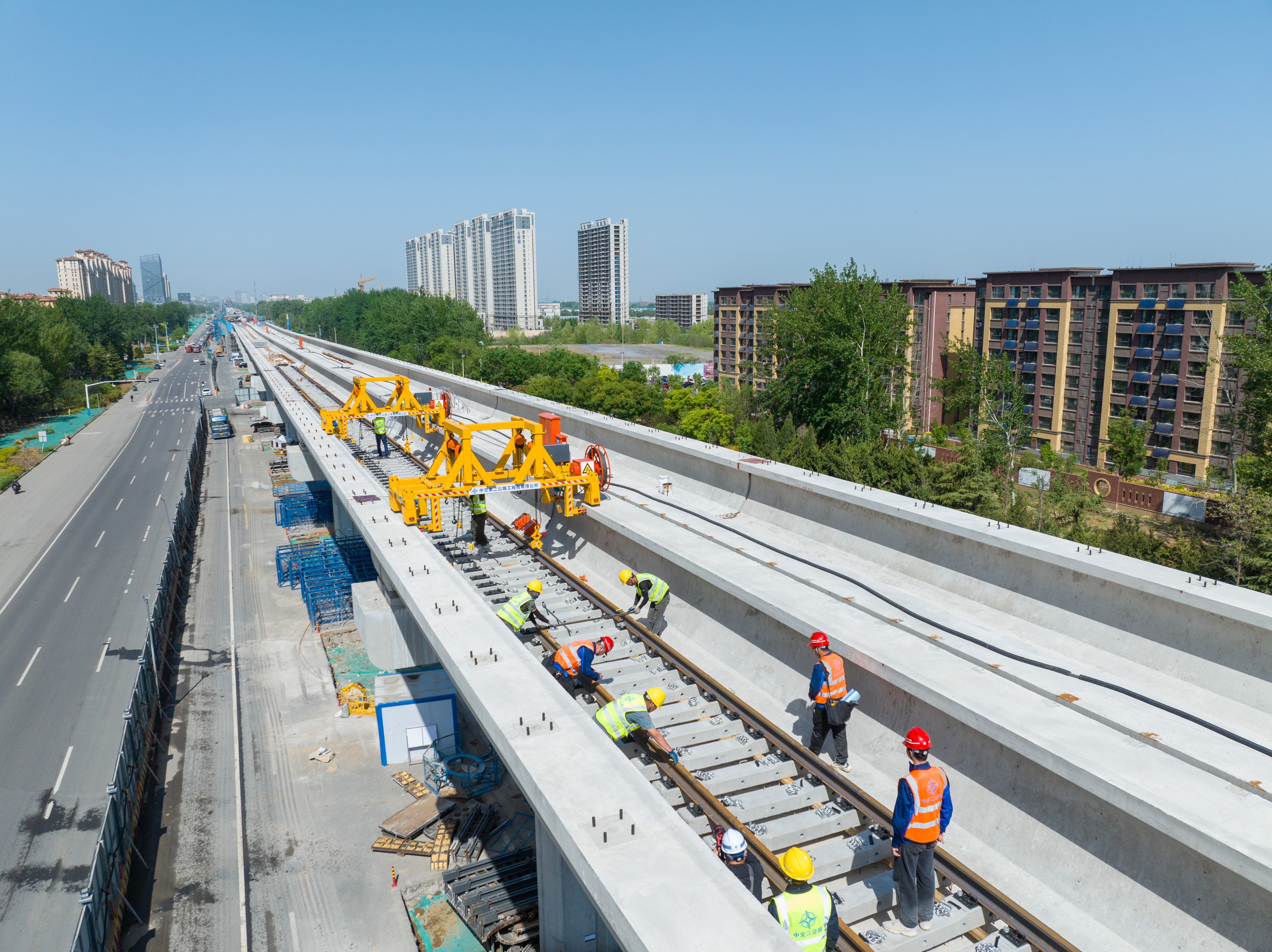 据悉,8号线自开工以来,各参建单位科学组织施工,强化资源配置,严控管理措施,各项建设任务高效有序推进,此次铺轨较年初施工计划提前了20天。为进一步加快进度,8号线铺轨采用“散铺法”,在高架段设四个铺轨点进行施工,目前已进场工人60余人,后期根据施工计划将陆续新增施工人员。