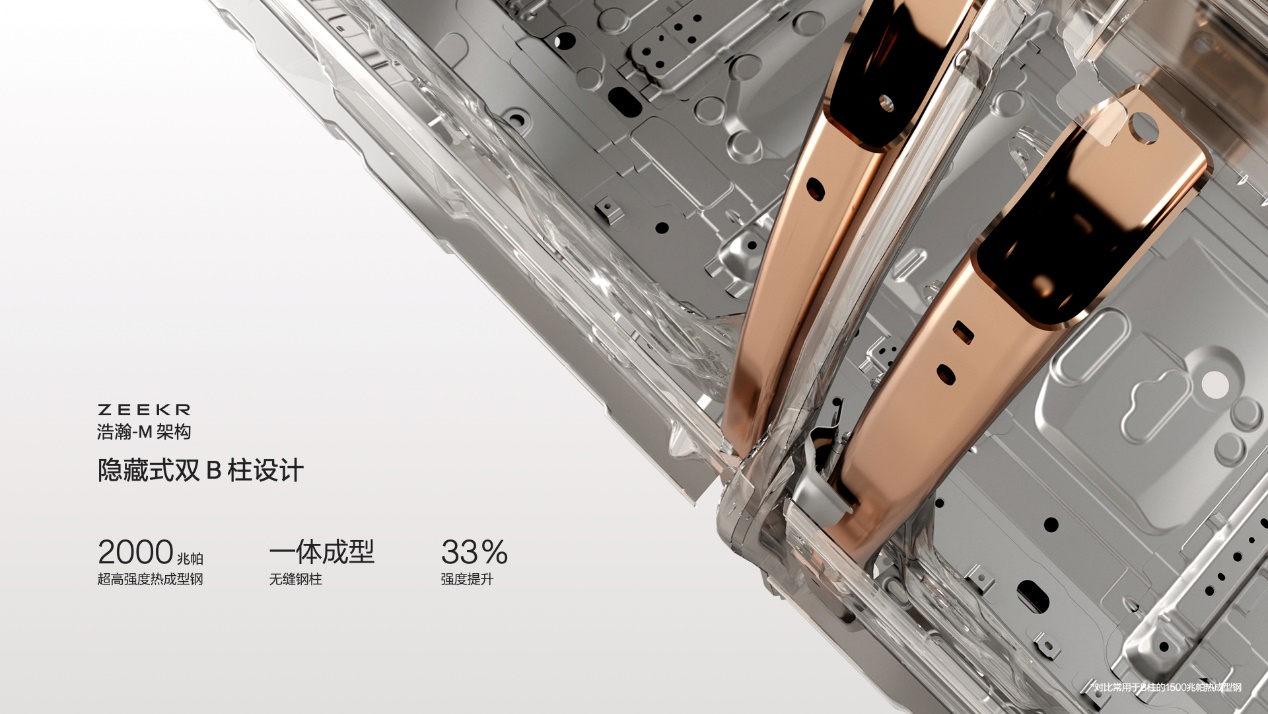 作为将安全写进基因的品牌,极氪同样将浩瀚-M 架构的安全做到了极致。浩瀚-M 架构采用了极氪首创的「隐藏式双B柱设计」,相较传统 B 柱材料强度提升了33%,在每一侧的车门内,都装备了两根直径约70毫米的超高强度钢柱,且每根钢柱都采用2000兆帕超高强度热成型钢,与建造潜艇的材料强度相当,并通过热气胀一体成型工艺,确保从内到外,没有任何缝隙。