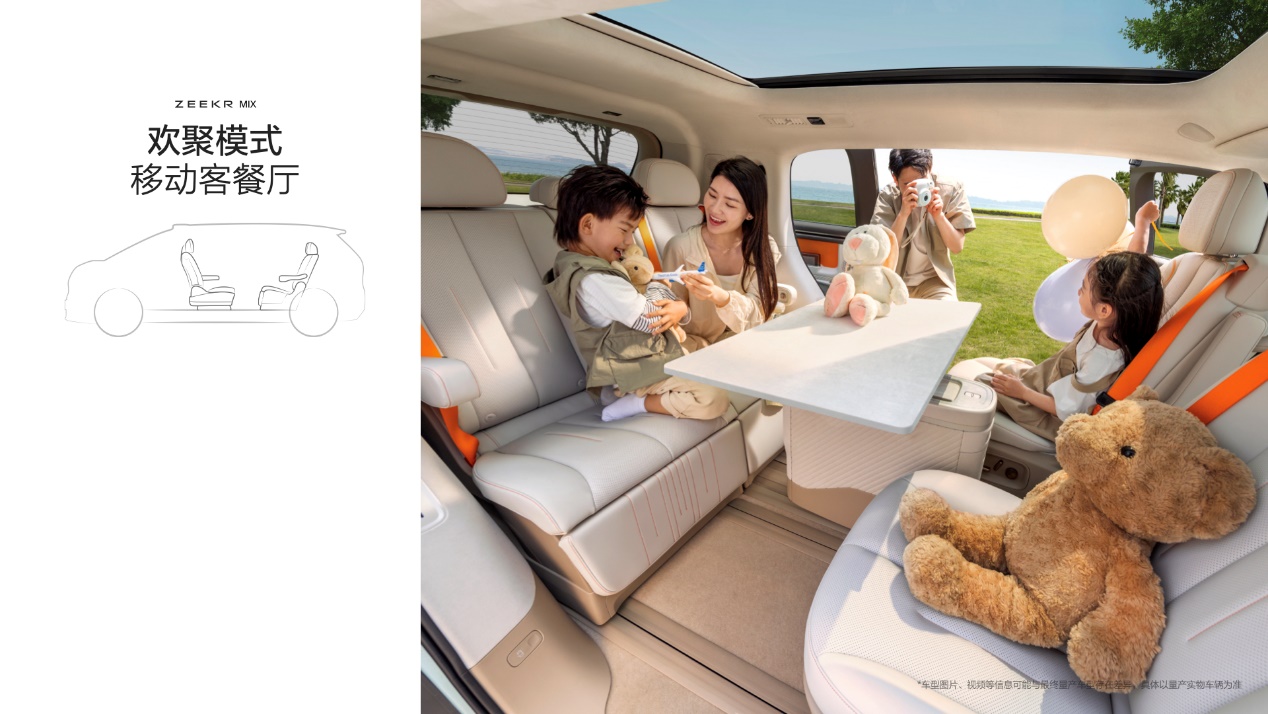 从欢聚模式、到宝宝模式,再到观景模式,极氪 MIX带给用户前所未有的出行体验。欢聚模式开启后,前排座椅后转 180 度,实现四人对坐,搭配可拓展桌板,座舱就变成了“移动客餐厅”,时刻享受与家人朋友的欢聚时光;宝宝模式,专为带娃家庭定制开发,开启后会在座舱内创造一个面积近1.5平米,高度1.35米的空间,8岁以内的儿童可以完全站立,自由玩耍,秒变“专属儿童房”;年轻人最喜欢的观景模式,开启后主驾、副驾座椅外转90度,可以座舱让变成“移动的阳台”,在忙碌中可以偶尔停下来欣赏路边的风景。未来,极氪将会与用户共创更多场景模式,并通过OTA,持续拓展升级。