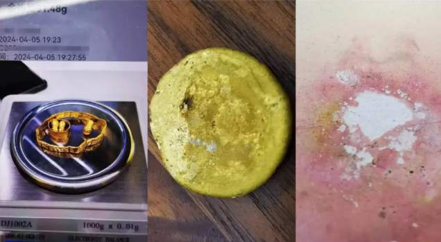 左:张女士5件金饰品熔前称重;中:熔后的黄金表面有黑点,还粘上了白色坩埚的锅底灰;右:坩埚锅底疑似粘上了黄金,伴随部分锅底剥落。