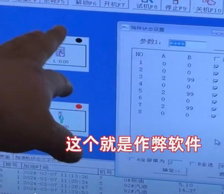 向当地市场监管部门举报后,在涉事的两家加油站内发现了操控作弊软件的电脑,superB太现场演示了其作弊功能。