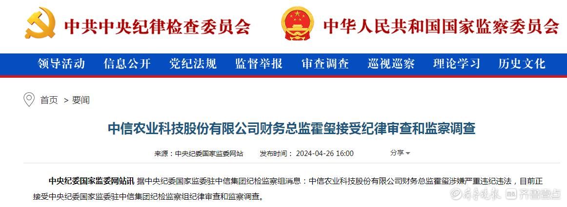4月26日,中央纪委国家监委网站通报,中信农业科技股份有限公司财务总监霍玺接受纪律审查和监察调查。