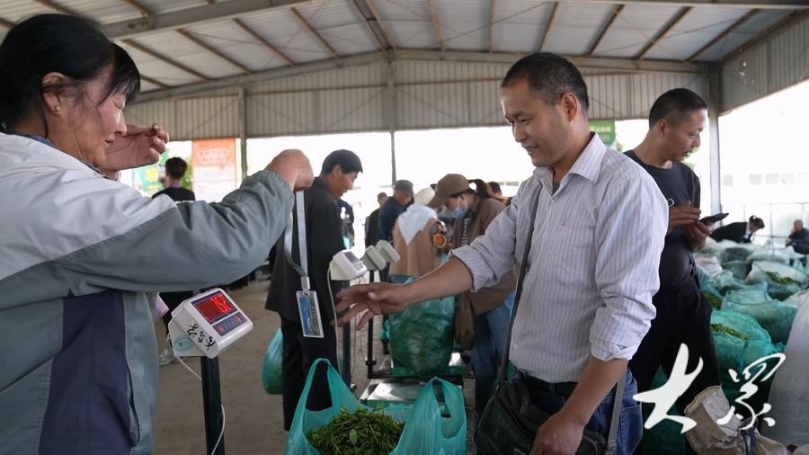 骑行十多分钟,她来到薄家口茶叶鲜叶交易市场,在熟悉的茶商摊前拿出了刚摘的鲜叶。茶商接过袋子,抓起一把鲜叶翻看,又在鼻前仔细嗅了嗅说:“嗯,茶叶没问题”。然后将鲜叶放在了溯源秤上。“今天茶叶110块钱一斤,你这些三两,一共33块钱。”刘春明从兜里拿出了自己的惠农卡,在与溯源秤相连的POS机上刷了一下,相应的钱就到了刘春明的账户上。