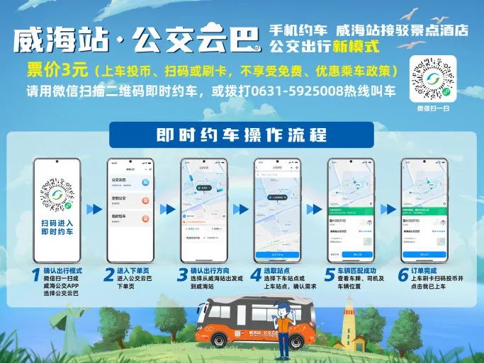 服务流程:乘客通过手机微信扫码、电话下单等方式进行约车,下单后15分钟内,车辆到达下单站点,等候最多30秒后继续行驶。当车辆停靠在威海站时,还会增加一种发车模式,即车上乘客达到车辆荷载人数后立即发车。