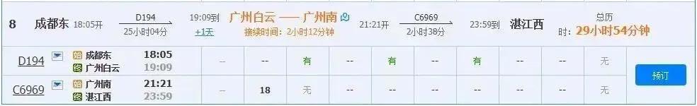 举个例子:成都—湛江直达车票已售完,旅客可选择中转换乘的方式出行,第一程成都—广州白云、第二程广州南—湛江西,广州白云与广州南两车站间,需要通过其他交通方式前往换乘。