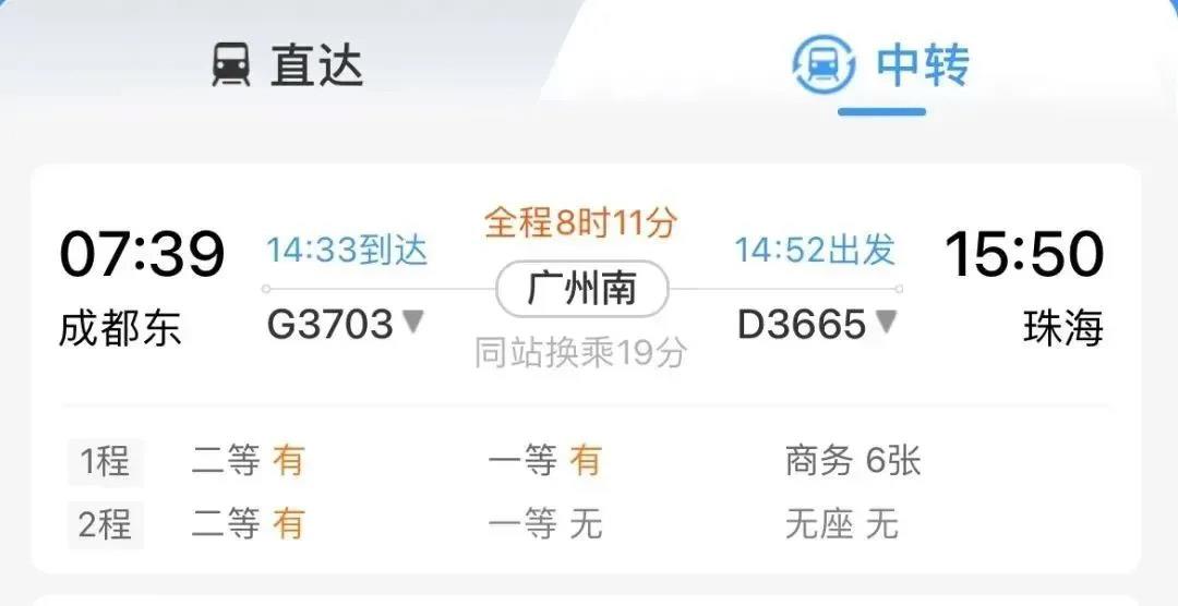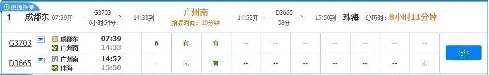 举个例子:成都东—珠海没有直达列车,通过12306官网查询系统推荐广州南进行换乘,第一程到站与第二程发站均为广州南,只需要站内换乘即可。