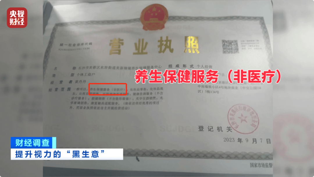 记者在店里悬挂的营业执照上看到,这家视力提升摘镜中心的经营范围明确写着:养生保健服务(非医疗),并没有视力提升摘镜的内容。