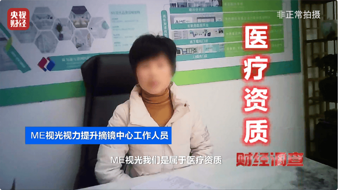 ME视光视力提升摘镜中心的工作人员还特别强调了他们机构的背景,宣称自己是医疗机构,但当记者索要这些机构相关的医疗资质证明时,工作人员却无法提供。