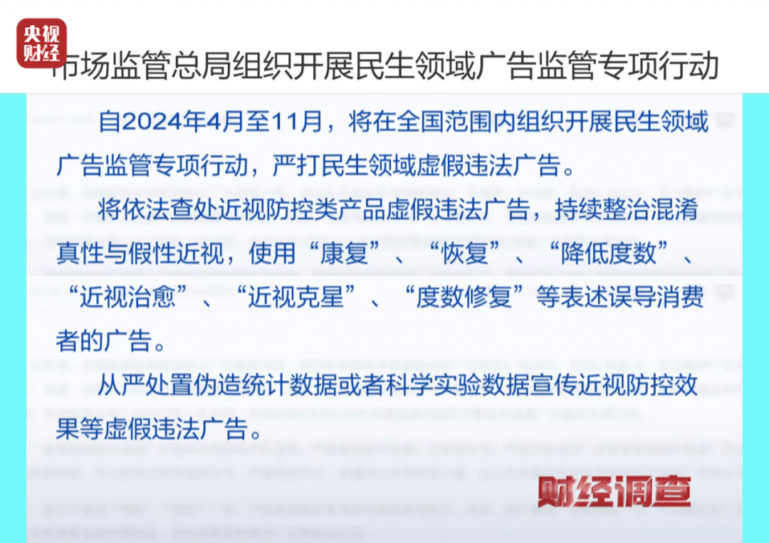 2024年4月9日,国家市场监督管理总局发布消息,将依法查处近视防控类产品虚假违法广告,持续整治混淆真性与假性近视,使用“康复”“恢复”“降低度数”“近视治愈”“近视克星”“度数修复”等表述误导消费者的广告。