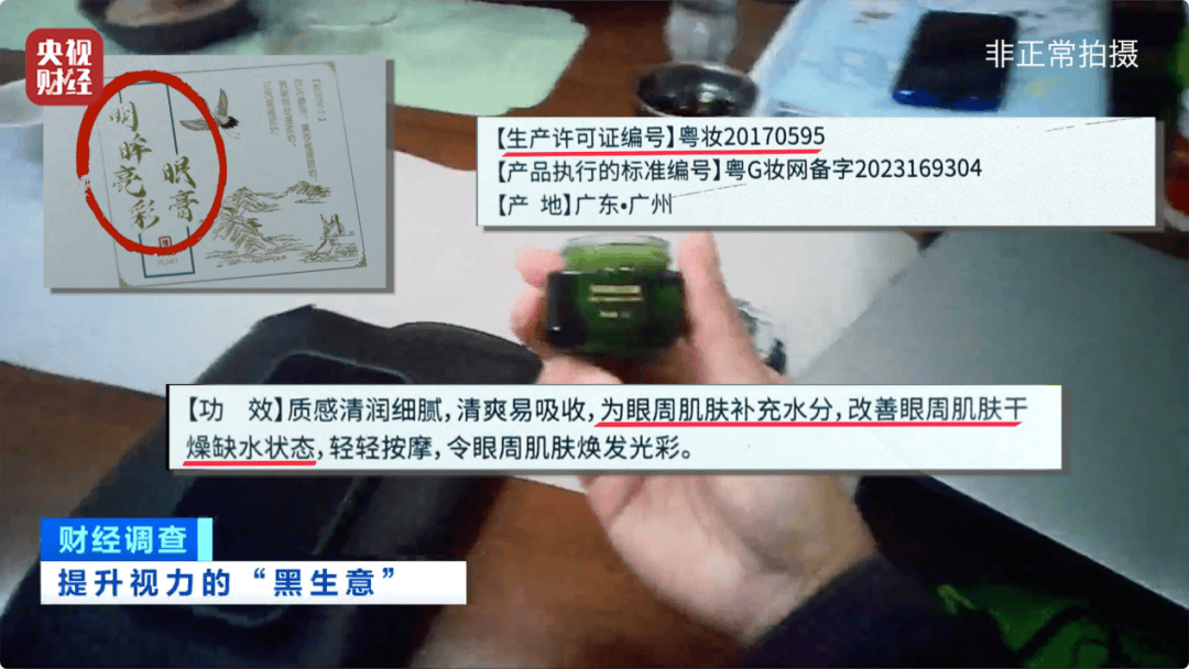 这款千里目保健膏外包装上的产品名称是明眸亮彩眼膏,功效是:为眼周肌肤补充水分、改善眼周肌肤干燥缺水状态。生产许可证编号是粤妆20170595。产品标示上并没有店员所说的二十四味中药,也没有标明其他的治疗功能。按照国家产品标示的规定,这个商品只能归纳为普通化妆品的范围。