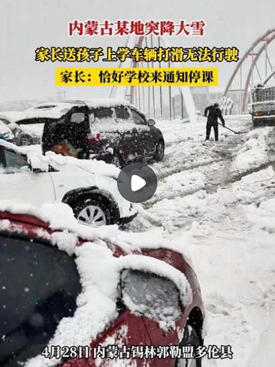 内蒙古一地突降大雪,家长送孩子上学车辆打滑无法行驶(视频截图,来源:延边广播电视台)同样在4月28日,内蒙古多地降雪。当日上午,有多伦县城居民表示,自己驾车送孩子上学的路上,发现有很多车辆“趴窝”,被堵了四十多分钟,在途中,接到学校通知称停课一天。