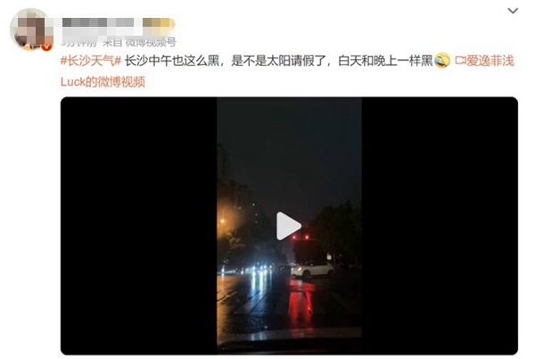 4月29日,中午12时40分左右的长沙(来源:九派新闻)李女士的朋友也纷纷在群里分享长沙中午昏暗如晚上的照片,外面已经亮起了路灯,朋友圈更是被“黑夜”刷屏,不少长沙居民纷纷调侃起来,“今天中午去吃个宵夜吗?”“长沙果然是国际化大都市,五一来长沙旅游的朋友们记得倒时差。”