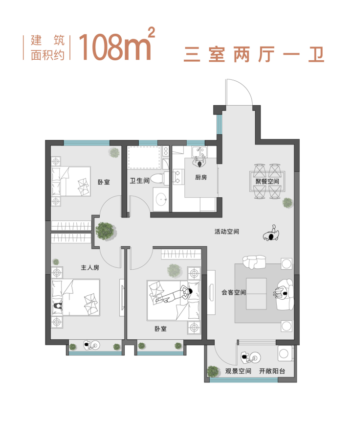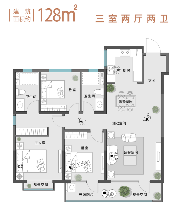 约128平米户型相比约122平米户型,实现了双阳台生活、休闲两种需求,客厅更加开阔,居住舒适度更高。