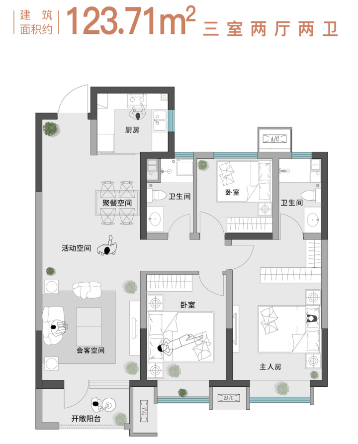 约122-124平米户型为三室两厅两卫,主卧为套房设计,私密性更强,整体户型可以满足一家四口的居住需求。