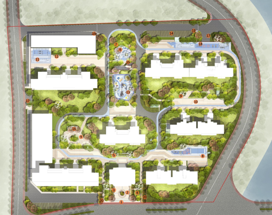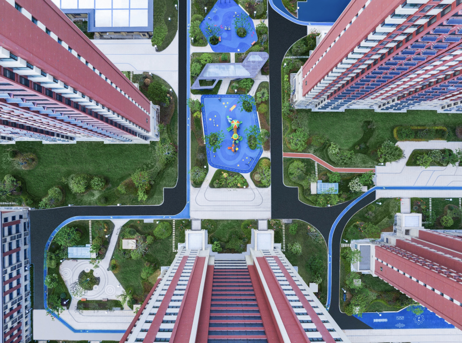 通过鸟瞰图角度,也清晰的看到了8大生活场景中大部分内容的呈现。其中500m环形健康夜光跑道更是环绕整个小区,在夜间通过照明系统串联整个小区;活动空间、阳光草坪、全龄活动空间、分龄式儿童乐园、邻里互动晒台等功能空间一应俱全。