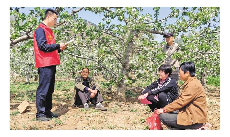 连日来,“沂源红”8支宣讲队组织农技专家和第一书记到苹果园里、樱桃树下、村居院落等小微宣讲站点,宣讲党的政策理论、惠民政策、农业生产知识,使基层理论宣讲更接地气。图为“沂源红”宣讲员在小微宣讲站点为果农进行宣讲。