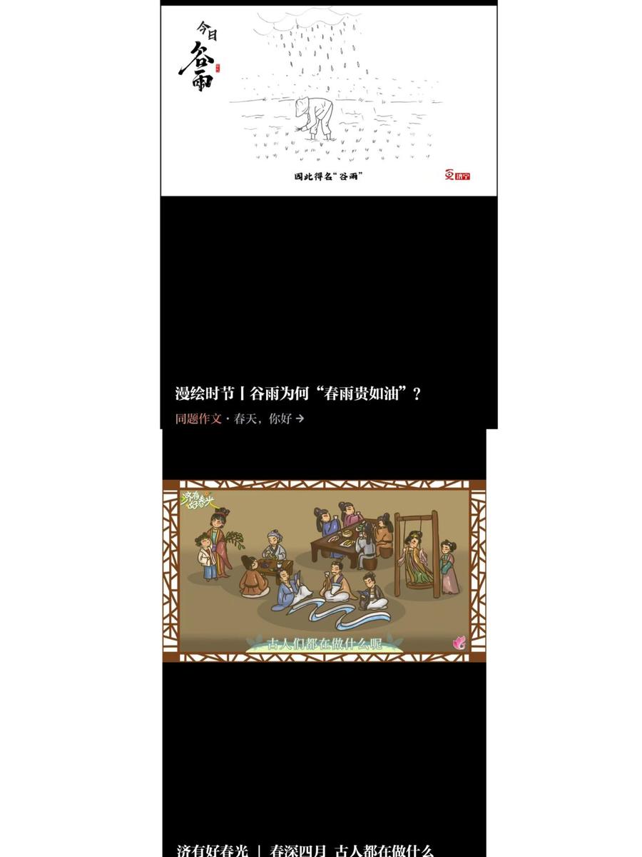 从形式来看,大众号号主们不断创新,形式丰富多彩。如大众号号主“叶落之秋传播”在谷雨节气出品的《迎谷雨 清晨竹露留下美丽瞬间》,通过摄影定格了清晨竹露的美丽瞬间;“汶上融媒”出品的《AI汶上春色》,以时下新颖的AI技术解锁曼妙春景;“巨野融媒”“新莱芜”“桓台发布”等大众号号主们则通过视频、图文等形式科普花粉季、飞絮季如何预防过敏;“更济宁”出品的《漫绘时节|谷雨为何“春雨贵如油”?》以漫画的形式揭秘了谷雨时节“春雨贵如油”的奥秘;“山东通信圈”《@所有人:旖旎春色,泰安移动“移”起打包给你》则通过手绘画的形式展示了通信行业在春日工作的场景……