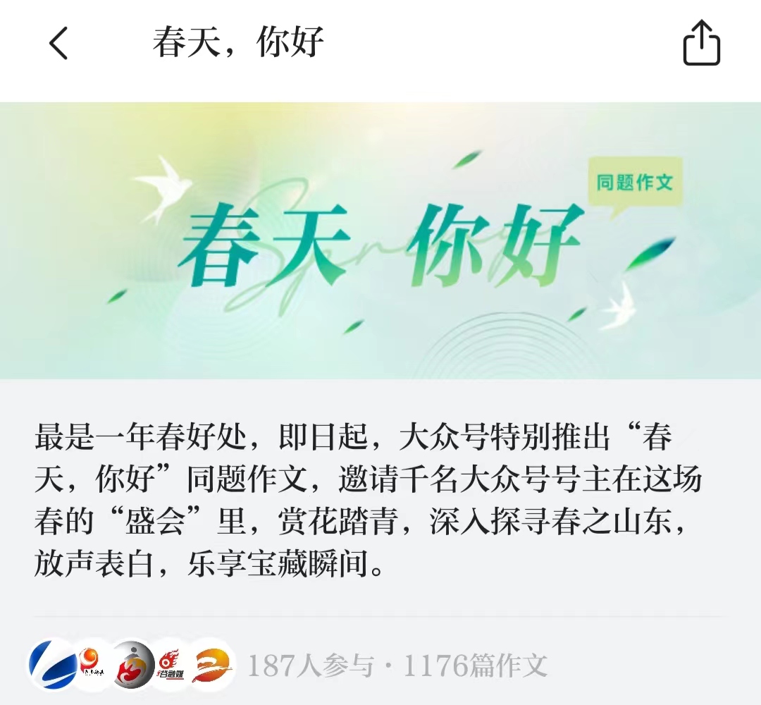 春天,是“吹面不寒杨柳风”;春天,是“樱杏桃梨次第开”;春天,是“桃花流水鳜鱼肥”;春天,是“虫声新透绿窗纱”……本周,即将迎来立夏节气,春意阑珊夏将至。今天,让我们再回望一次春天,即将与春作别——这个春天,由大众号发起的“春天,你好”同题作文邀请大众号号主们参与了一场春的“盛会”:赏花踏青,深入探寻春之山东。截至发稿,已吸引近200名大众号号主参与,创作了1176篇作文。
