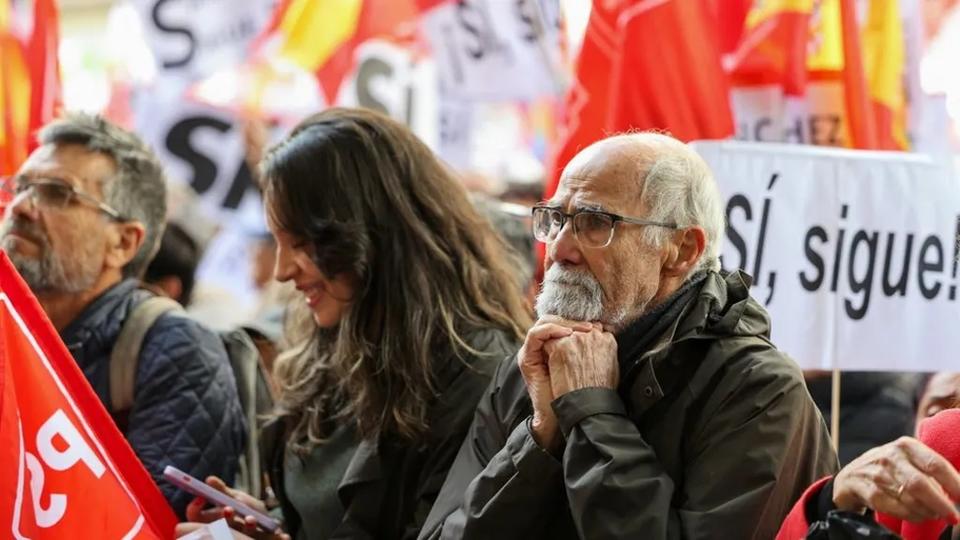 “桑切斯,留下来!”4月27日,上万名桑切斯的支持者从西班牙各地包车或乘大巴车来到首都马德里,聚焦在工人社会党总部外,打出“佩德罗,不要放弃”“你不是一个人在战斗”等标语,希望桑切斯不要辞职。西班牙第一副首相兼工人社会党副秘书长蒙特罗当天在该党总部外高呼:“首相留下来,我们和你在一起!”