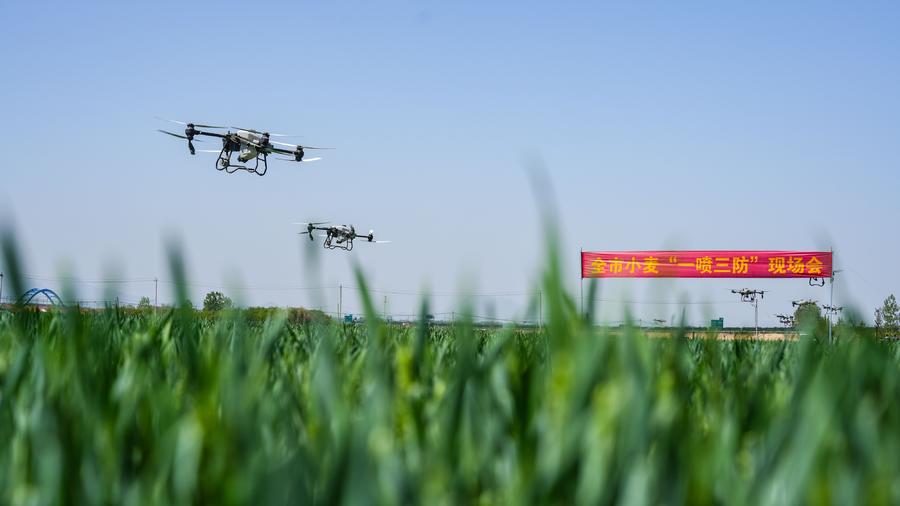 现代化农业场景中,农业无人机飞防植保(青岛市农业农村局供图)