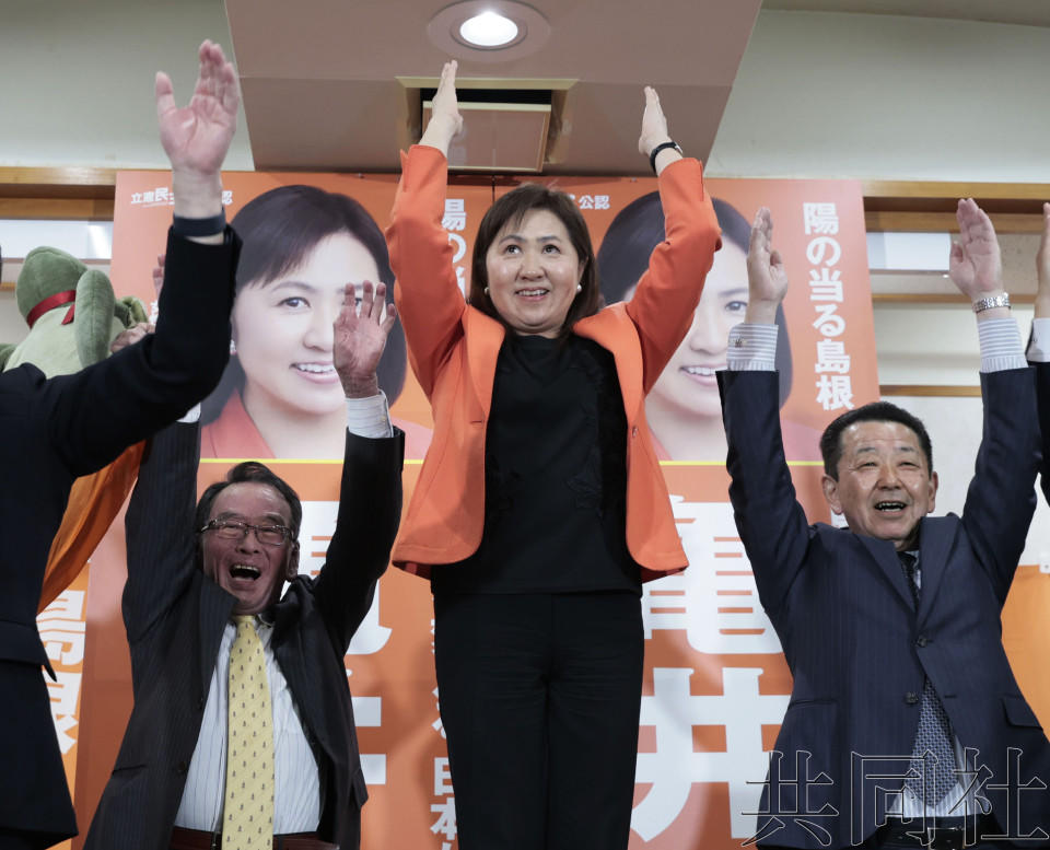 在岛根1区补选中当选的立宪民主党前众议员龟井亚纪子(中)庆祝胜利。