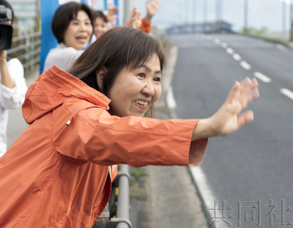 在岛根1区补选中获胜的立宪民主党前议员龟井亚纪子在街头挥手致意。