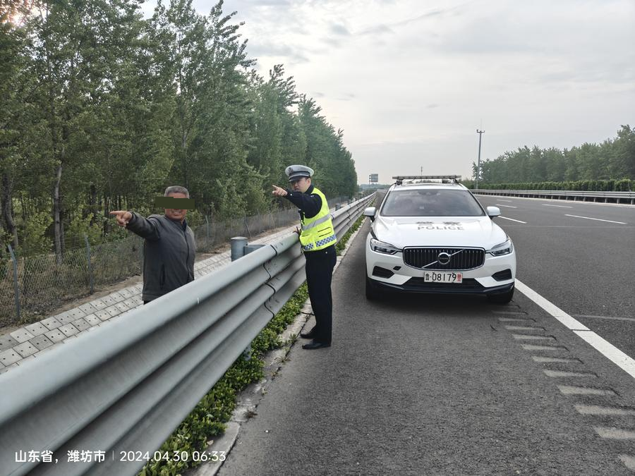 4月30日早上,山东省公安厅交通警察总队五支队高密大队巡逻民警在执行日常巡逻任务中,在济南方向91km附近,发现一名老人正在高速公路应急车道内沿着道路逆向行走,周围车辆呼啸而过,纷纷靠左避让,情况十分危险。