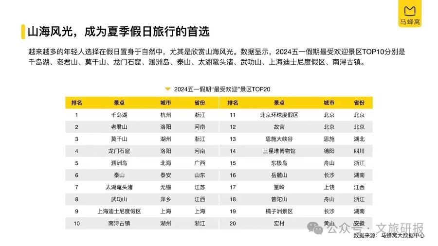 5月6日,记者从文旅研报了解到,2024年“五一”假期最受欢迎景区TOP10分别千岛湖、老君山、莫干山、龙门石窟、涠洲岛、泰山、太湖鼋头渚、武功山、上海迪士尼度假区、南浔古镇,其中泰山排名第6。