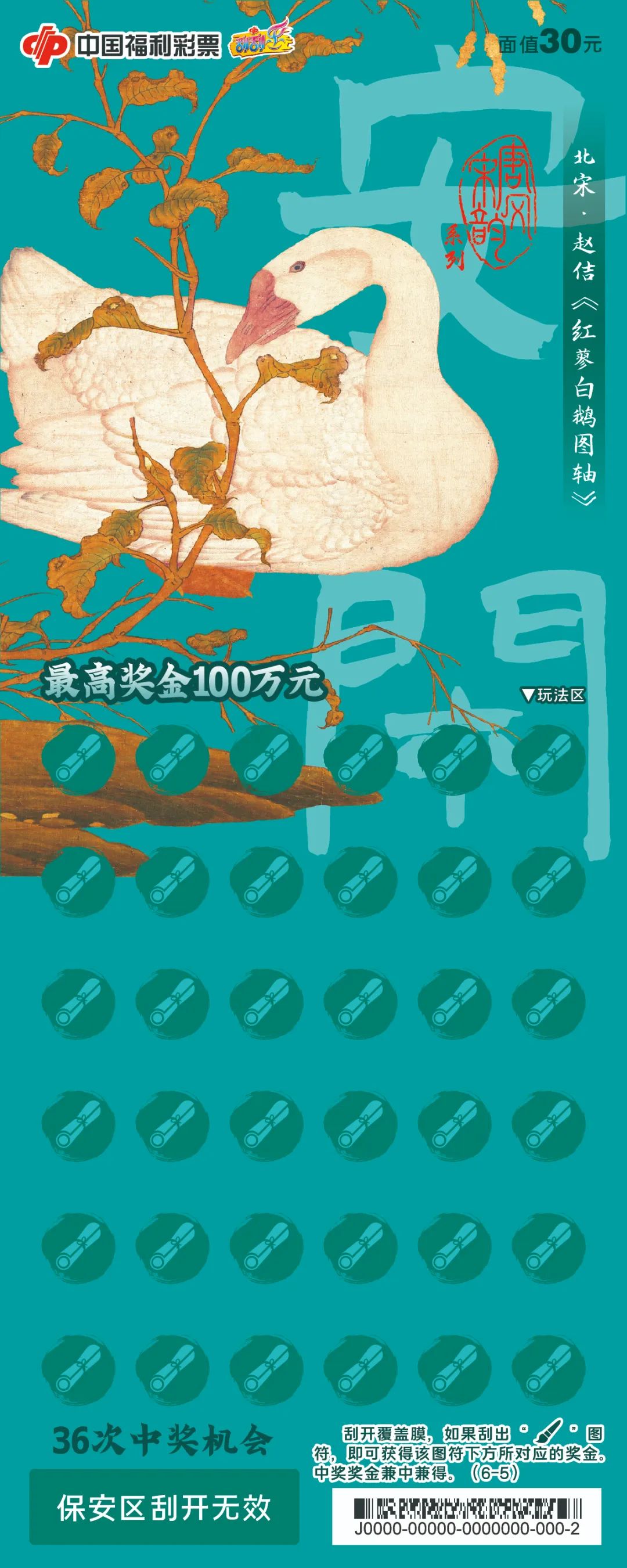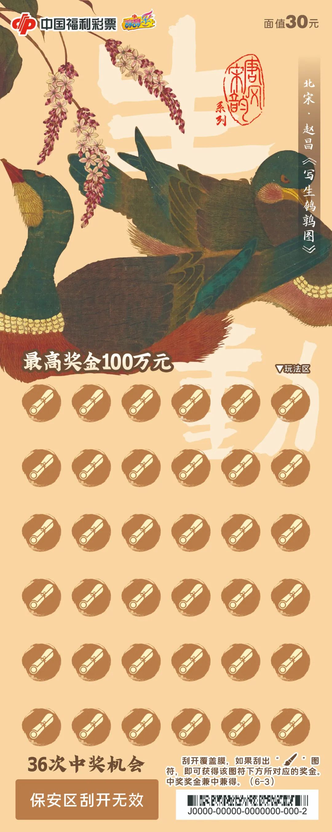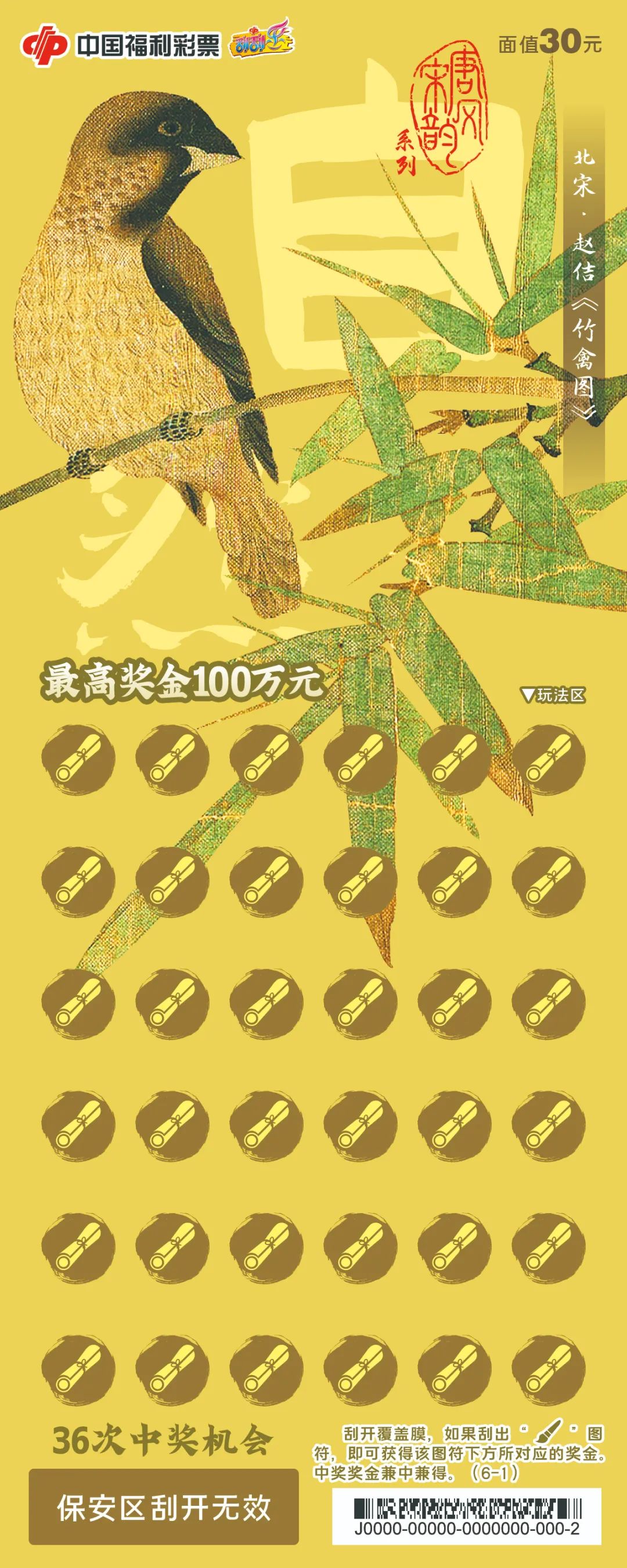 该款彩票票面采用唐代和宋代名家的绘画作品作为设计元素,将传统的艺术元素结合现代的排版和设计手法,使彩票既具有古典韵味又不失现代感,极具收藏价值。