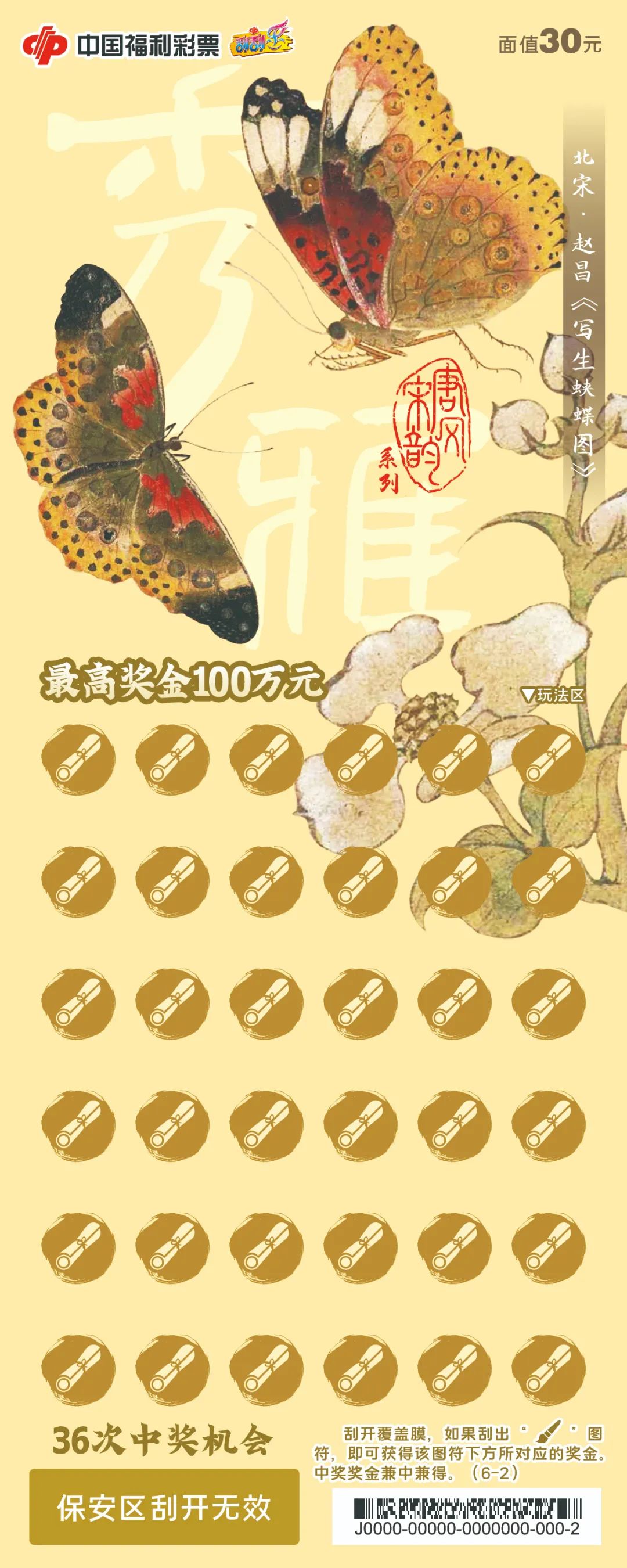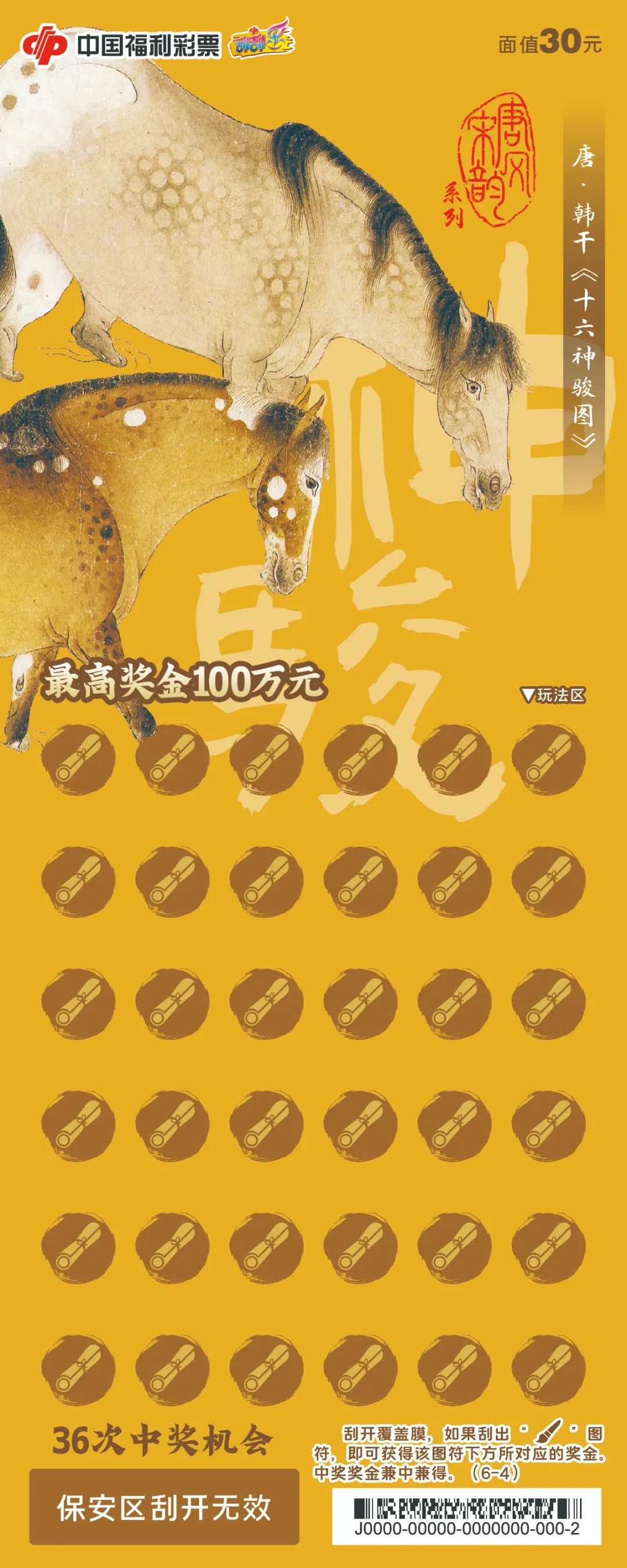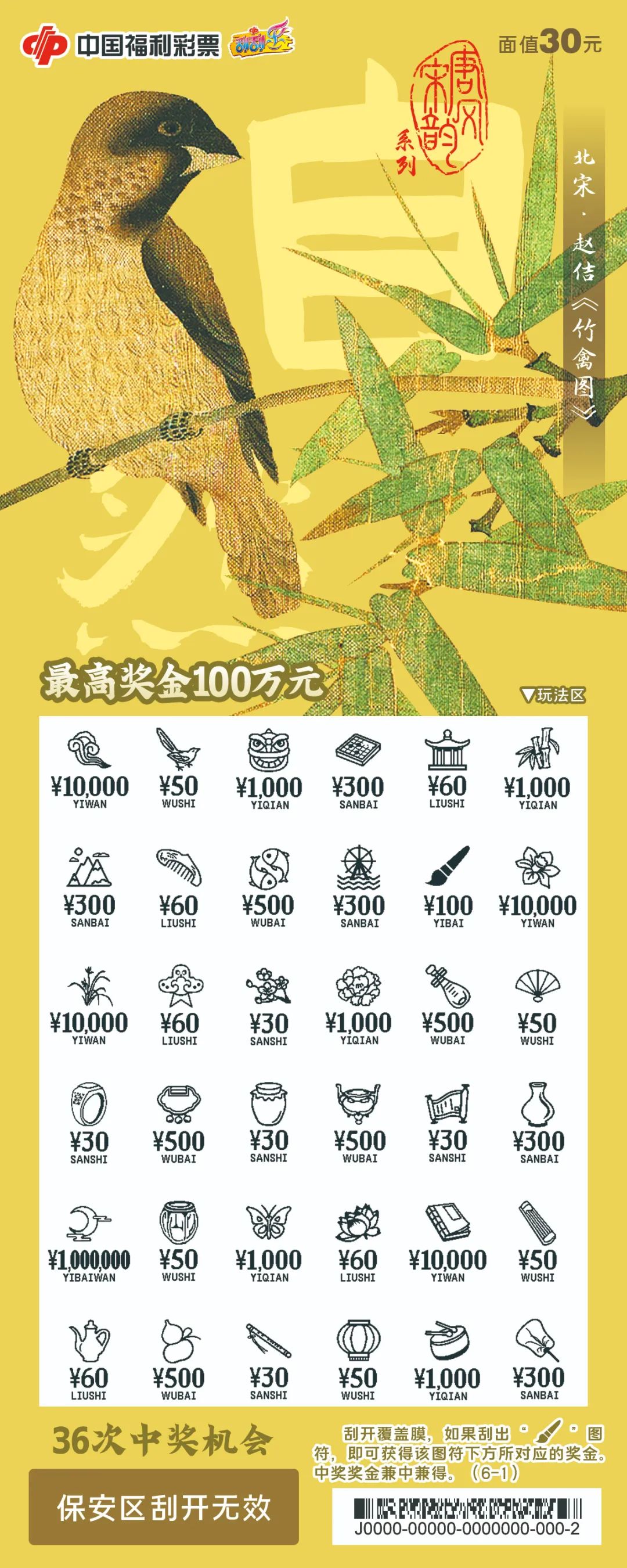 该款彩票一套6枚,面值30元,奖级9级,最高奖金100万元,共36次中奖机会,奖金返还率为65%,中奖面为37.32%。