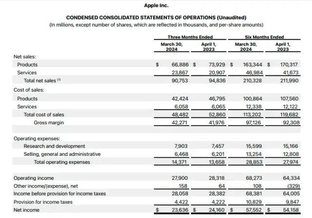 在截至2024年3月30日的第二财季,苹果公司总营收为907.53亿美元,与去年同期的948.36亿美元相比下降4%,不过要好于市场预期的903.3亿。