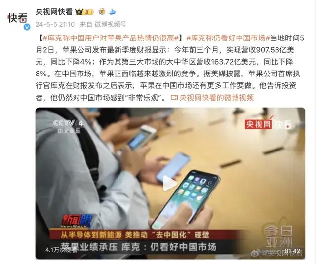 据央视网快看微博,库克称中国用户对苹果产品热情仍然很高。在中国市场,苹果正面临越来越激烈的竞争。据美媒披露,苹果公司首席执行官库克在财报发布之后表示,苹果在中国市场还有更多工作要做。他告诉投资者,他仍然对中国市场感到“非常乐观”。