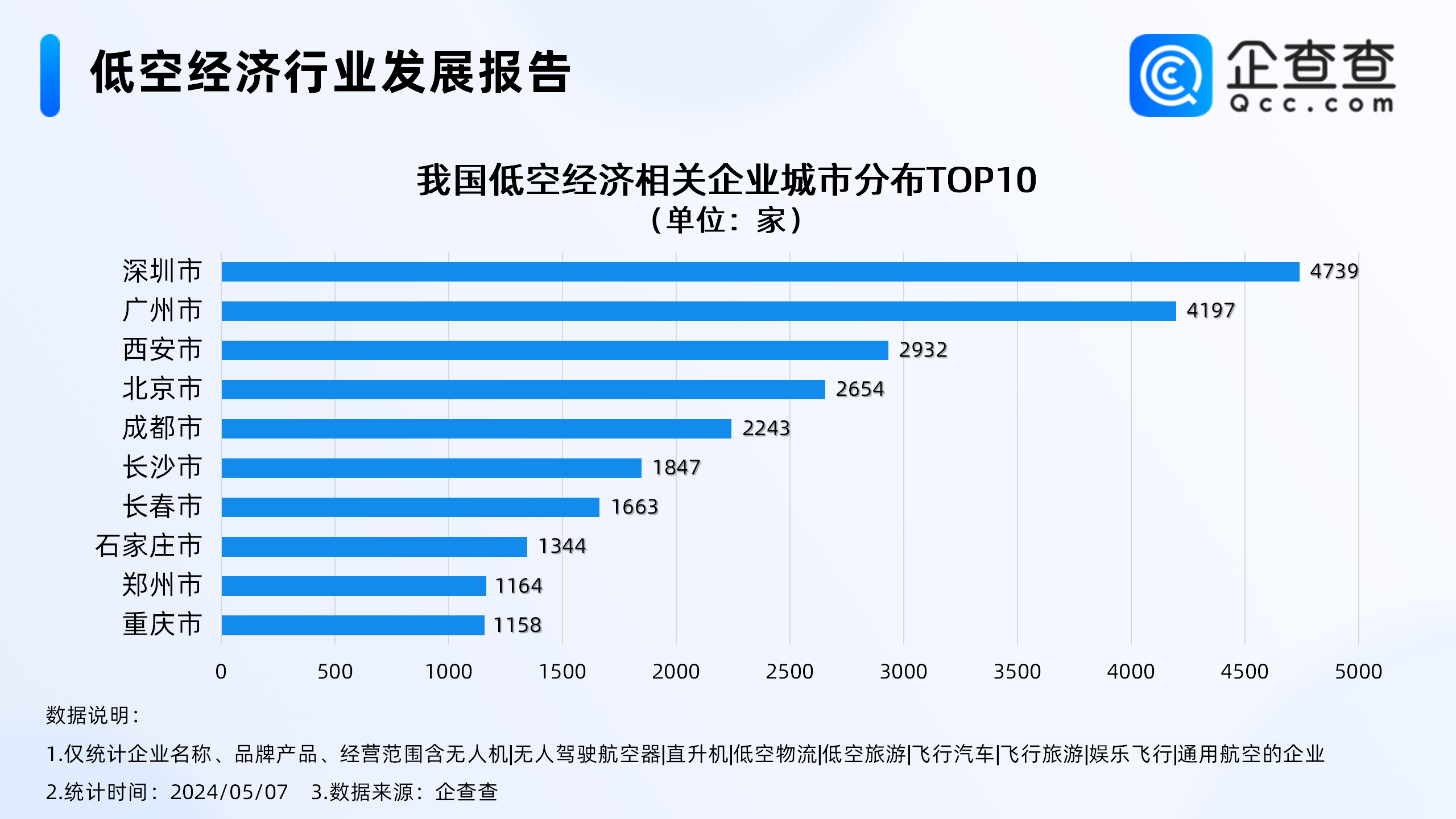 企查查数据显示,国内现存低空经济相关企业7.05万家。近十年其注册量呈整体增长态势。2023年,低空经济成为大多数城市看准的“新赛道”,注册量达0.89万家,同比增长36.42%。截至目前,今年已注册0.25万家。从城市来看,深圳现存4739家低空经济相关企业,位居第一。广州、西安分别现存4197家、2932家,位居前三。