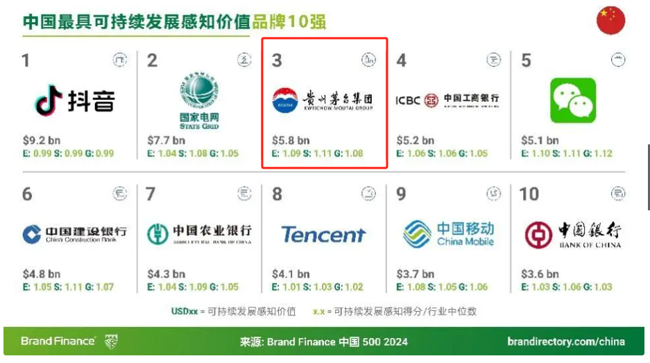 贵州茅台以501亿美元的品牌价值位于2024年中国最具价值品牌榜第七名,与2023年排名持平,继续领跑白酒行业;以58亿美元的可持续发展感知价值,位列中国最具可持续发展感知价值品牌榜第三名,是10强中唯一的白酒企业。