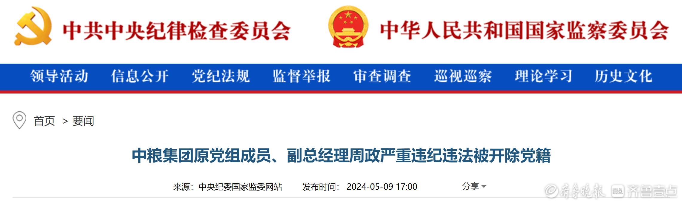 中央纪委国家监委网站5月9日通报,中粮集团原党组成员、副总经理周政严重违纪违法被开除党籍。