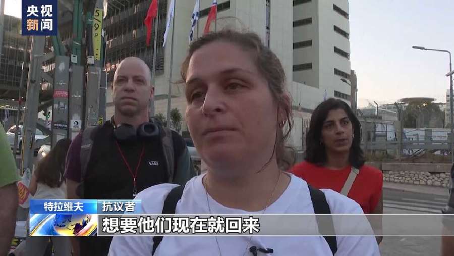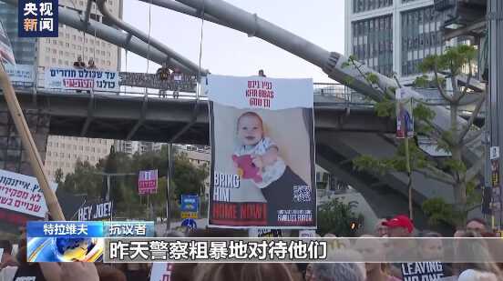 抗议者:有一份停火协议就摆在谈判桌上,很明显,内塔尼亚胡政府正在试图推迟达成协议,以便战争能够延续。如果我们只是安静地坐下来,没有人愿意倾听我们的声音,尤其是被扣押人员家属的声音。昨天警察粗暴地对待他们,所以我来到这里声援他们,努力争取被扣押人员获释。