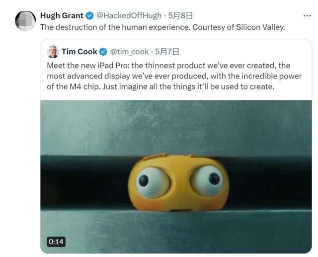尽管这则广告目前仍在苹果首席执行官蒂姆·库克的Twitter账户上,且在社交媒体上的观看次数超过5300万次,但它仍给苹果本周推出的新iPad版本和M4芯片的正面形象带来了不小的影响。有社交媒体用户表示,这则广告让他们对苹果产品的看法大打折扣,甚至有人说广告让他们产生了“减少生活中技术使用”的想法。