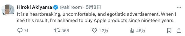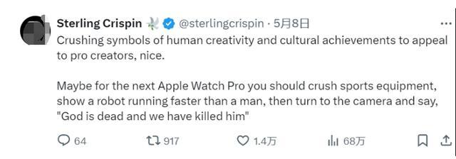 有网友嘲讽称,苹果用粉碎人类创造力和文化成就的象征,来吸引专业创作者,真不错。